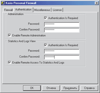 Установка пароля на изменение конфигурации брандмауэра и просмотр статистики, разрешения на удаленное подключение к Kerio PF осуществляются во вкладке Authentication приложения Firewall Administration. В Miscellaneous в группе Firewall Engine Service можно выбрать, запускать ли брандмауэр при старте операционной системы или вручную. Kerio PF позволяет использовать несколько профилей конфигурации — группа Firewall Configuration Files.