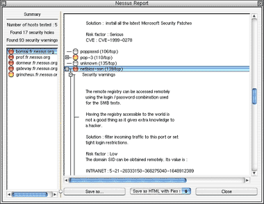 После завершения сканирования Nessus представит отчет о полученных результатах с указанием списка уязвимых мест, рекомендациями по их устранению и уровнем риска для каждого из них. Можно сконфигурировать сканер таким образом, что после первоначального исследования системы в дальнейшем он будет опираться на полученные данные, отмечая только изменения в результатах исследования.