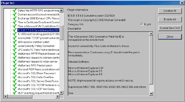 Проверить надежность сервисов с его помощью можно как стандартными методами, так и имитацией сетевых атак с использованием базы данных, содержащей перечень уязвимых мест. Эта БД построена на модульном принципе, что обеспечивает необходимую гибкость в процессе работы. Для описания обнаруженной уязвимости и включения ее в базу данных в виде отдельного модуля применяется язык программирования Си или специально разработанный язык сценариев NASL — Nessus Attack Scripting Language. База данных обновляется практически ежедневно.