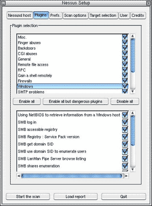 Работать с графическими клиентами для Nessus несколько проще. Используя графическую оболочку, можно быстро настроить параметры сканирования. Поддерживается экспорт отчетов в документы формата ASCII text, LaTeX, NSR, HTML, HTML с диаграммами.