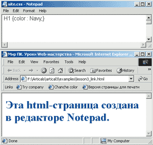 | Код стилевой таблицы site.css в Notepad и вид страницы в Internet Explorer |