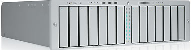 Дисковые массивы состоят из двух независимых контроллеров с кэш-памятью по 128 Мбайт каждый (максимум — 512 Мбайт). Два съемных блока питания обеспечивают надежную защиту от непредвиденных сбоев. Подключение к серверу происходит по оптическому порту с пропускной способностью 400 Мбит/с. Для этого в сервер необходимо установить PCI-контроллер, поставляемый отдельно. Контроллеры поддерживают уровни 0, 1, 3, 5, 0, +1, 10, 30 и 50 (причем уровни 10, 30 и 50 требуют установки дополнительного ПО). Предусмотрена возможность объединения с Xserve.