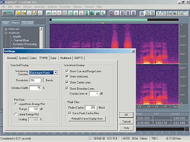 Переключаться между этими режимами можно простым нажатием кнопки Toggle between Waveform and Spectral views в верхней панели инструментов. Но для более осмысленного использования режима spectral необходимо выполнить его настройку, так как преобразование Фурье само по себе несовершенно и при разных параметрах может давать значительно различающиеся частотные характеристики. Поэтому лучше воспользоваться меню Options?Settings и в панели Display?Spectral Display задать различные параметры для алгоритма преобразования Фурье (рис. 3).