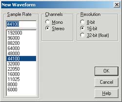 Теперь нужно запустить редактор и создать новый документ — либо через меню File, либо нажав на кнопке Create new wave (названия кнопок выводятся при размещении курсора мыши над ними). Возникнет окошко для задания параметров сэмпла (рис. 4).