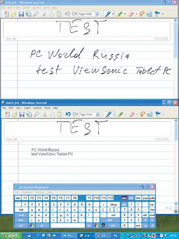 Модифицированная операционная система Windows XP for Tablet PC практически идентична Windows XP, но позволяет работать пером как мышью, а также имеет несколько приложений, в которых распознается текст, вводимый пером. В частности, после нескольких экспериментов с Windows Jornal эта программа смогла без ошибок распознать фразу на английском: «Тестирование V1100 журналом «Мир ПК». Система распознавания рукописного ввода русского языка в этой модели пока не реализована.