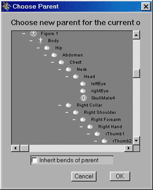 - Командой меню Object? Change Parent ("Объект?Установить родительскую связь") вызовите диалоговое окно Choose Parent, схожее с диалоговым окном Choose Figure (рис. 3). В окне найдите элемент фигуры, к которому вы хотите присоединить предмет одежды, например Figure 2?Head ("Фигура 2?Голова"), и щелкните на нем мышью. После этого надпись, соответствующая выбранному элементу фигуры, поменяет черный цвет на белый. Нажмите OK. Все, предмет одежды стал "дочерним" объектом по отношению к выбранному элементу фигуры.