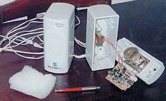 | Фото 1. Внутренности типичных компьютерных колонок. «Мочалка» слева выполняет роль звукопоглотителя |