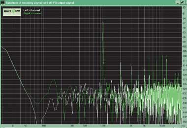 | Рис. 1. Пример возникновения гармонических искажений. При подаче сигнала частотой 1 кГц через каждый килогерц вплоть до 20 кГц возникают пики сигнала. Для наглядности эффект получен и усилен искусственно |