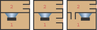 - Band-pass. Практически все сабвуферы компьютерных акустических систем имеют данный тип корпуса. Band-pass представляет собой двухкамерный ящик (добавлена резонансная камера 2), звук выходит через один или несколько фазоинверторов (рис. 2). Существует несколько разновидностей Band-pass, все они позволяют существенно повысить КПД, но сильно "размывают" басы, превращая их в монотонное гудение. Методы доработки корпуса - общие с другими типами корпусов (доработке подлежит только камера 1)