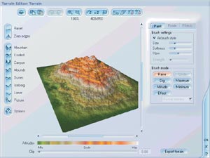 В Vue d?Esprit имеется Terrain Editor (редактор возвышенностей, рис. 6), с помощью которого довольно просто, но в то же время достаточно эффективно настраивается вид ландшафта. Один из способов его вызова — команда меню Objects?Create?Terrain in Editor.
