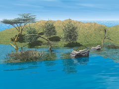 При создании ландшафтов в первую очередь желательно моделировать земную поверхность и только потом «насыщать» сцену объектами и задавать атмосферные явления. Чтобы земная поверхность превратилась в холм или в горный массив, программа должна иметь соответствующий встроенный редактор. Далее понадобятся различные трехмерные объекты: камни, деревья и другие растения. Выбор как будто небольшой, но ведь растений очень много, а такие объекты, как камни, должны иметь не только разную форму, но и выглядеть по-разному, чего можно добиться с помощью редактора материалов. К счастью, все перечисленное доступно в Vue d?Esprit.