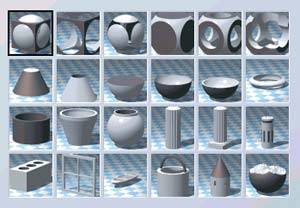 Вышесказанное означает, что с примитивами, образно говоря, можно выполнять математические операции: «складывать» их друг с другом, «вычитать» один из другого, определять область, одновременно принадлежащую двум объектам. Например, чтобы в кубе образовалась округлая выемка, следует вычесть из его объема объем вложенной в него части сферы. Таким способом моделируются достаточно сложные объекты, как правило, искусственного происхождения. Органические образования с помощью данной методики создавать сложнее, но все же возможно. На рис. 4 представлены типы объектов, полученных с помощью булевых операций.