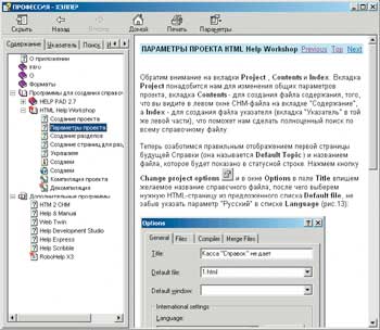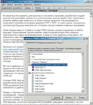 Система HTML Help предназначена не только для составителей технической документации и разработчиков программ. С ее помощью домашний пользователь может создавать архивы HTML-документов или подшивки электронных журналов и формировать все это в виде одного компактного и удобного файла с расширением .CHM (компилированный HTML-файл). При открытии такого файла он напоминает Web-страницу с фреймовой структурой: в левом окне находится оглавление «Справки», а в правом отображается содержимое страницы.