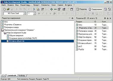 Начнем с создания «Справки» в формате WinHelp на примере этой статьи. Главное окно программы характерно для приложений подобного класса (рис. 3). В левой части расположено окно текстового редактора, сильно напоминающее интерфейсом знакомый многим WordPad, а в правой находится список разделов будущей «Справки». Разумеется, сами по себе эти разделы не появляются — без хэлпера тут не обойдешься. Поэтому будет нелишним в начале работы набросать на листке бумаги примерную структуру справочного файла, другими словами — создать иерархию «Справки».
