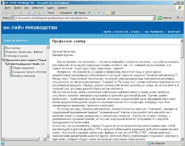 Очень интересна возможность создания справочных руководств для просмотра в онлайновом режиме, доступная по команде Make On-line Manual в меню «Проект». Программа за несколько секунд создаст такую «Справку» как X:Program FilesHelp Development Studioon-line manualindex.html. При открытии этого файла он будет выглядеть примерно так, как показано на рис. 7. Настройки для онлайнового формата вызываются командой On-line Manual Options в меню «Сервис».