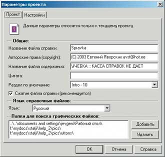 На вкладке «Проект» обязательно включите опцию «Сжатие файла» (если только вам не нужен монстрообразный справочный файл). Также не следует забывать о языке «Справки». Информация, введенная в поле «Название файла содержания», будет отображаться в заголовке CNT-файла, а ваши ФИО и прочие данные, любовно вписанные в поле «Авторские права», будут доступны взору всех желающих при нажатии кнопки «Версия» в панели созданной «Справки».