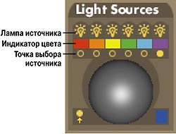 Внешний вид объекта во многом определяется освещением сцены. Так, использование слабых источников света приводит к затемнению изображения, а освещение яркими источниками, напротив, стирает призрачные тени. Иными словами, продуманная схема освещения во многом определяет успех замысла художника. Предлагаю немного развлечься и пощелкать лампочками освещения (рис. 13). Щелчок на пиктограмме горящей лампочки выключает источник, а пиктограмма приобретает вид выключенной лампы.