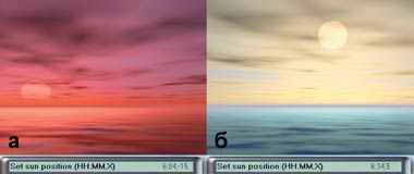Наблюдение за работой фильтра начнем с раннего утра. Щелкнув в любой точке виртуального шарового манипулятора редактора солнца (Sun Editor — рис. 2, в центре), можно перемещать светило в том или ином направлении. При этом показания ЖК-дисплея отражают его расположение (рис. 3). В первом случае (рис. 3, а) солнце занимает позицию, соответствующую 6 ч 04 мин (цифра после запятой определяет горизонтальное расположение светила — его X-координату), а во втором (рис. 3, б) — 6 ч 30 мин.