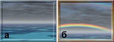 Вспомним теперь какую-нибудь картину Айвазовского с бурным морем и грозой. Но вот непогода прошла, и перед нами радуга. Попробуем создать такое настроение. Прежде всего, пользуясь параметрами облаков, изобразите море и грозовое небо (рис. 5, а). Затем щелкните на переключателе расположения солнца. В небе появится радуга. Чтобы усилить эффект, добавьте ей яркости, переместив для этого соответствующий ползунок на панели редактора радуги. Но и это еще не все. Нажав кнопку с пиктограммой камеры (рис. 2), поверните ее таким образом, чтобы моря стало меньше, а неба больше. Обратите внимание, что на картине появилась сестричка нашей радуги, и жить стало намного веселее. Можно также создать отражение радуги в воде, воспользовавшись возможностями трансформации, предоставляемыми программой Photoshop (рис. 5, б).