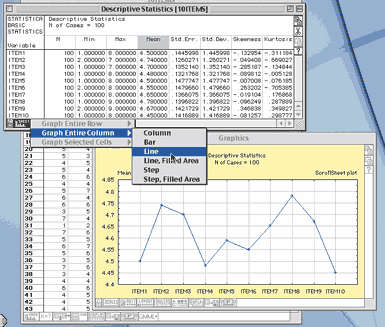 Помимо таблиц данных STATISTICA оперирует еще несколькими типами окон и файлов. Один из них — таблицы результатов (ScrollSheets). Кроме своего функционального назначения — представлять результаты статистического анализа, — они мало чем отличаются от таблиц данных, их тоже можно редактировать, сохранять как отдельные файлы собственного типа или же как файлы данных для последующего анализа. В них также представлены панели инструментов, позволяющие манипулировать полученными результатами. Например, легко сравнить средние значения переменных, полученные с помощью процедуры «Описательные статистики» (Descriptive Statistics), построив их график (см. рис. «Интерактивное взаимодействие с окном результатов», результат выбора выделенного пункта выпадающего меню — на заднем плане). Еще одну очень удобную возможность предоставляет кнопка «Далее» (Continue...) на панели инструментов таблицы результатов, позволяющая перейти к следующему шагу анализа или следующей таблице, если анализ предполагает вывод нескольких.