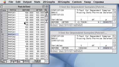 Приведем небольшой пример простого анализа данных в STATISTICA. Представим, что в наше распоряжение попали две программки («патча»), оптимизирующих работу какого-либо приложения. Наша задача — оценить, действительно ли улучшаются показатели его работы. Однократное испытание каждого из «патчей» (т. е. измерение производительности приложения до и после их применения) вряд ли сможет достоверно показать их эффективность, здесь необходимо несколько таких испытаний (хотя бы десять) и последующее статистическое сравнение результатов.