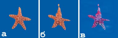 Рис. 18. Применение турбулентности к морской звезде: а — исходное изображение; б — обработка звезды; в — обработка окружающей среды |