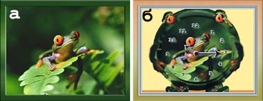 В последнее время гель стал очень популярен. Так, из него делают коврики для компьютерной мыши, подушечки под запястья и проч. Давайте же пойдем в ногу со временем — придумаем что-нибудь этакое. Возьмем, к примеру, фотографию экзотической лягушки (рис. 3, а) и превратим ее в новую модель часов (рис. 3, б).