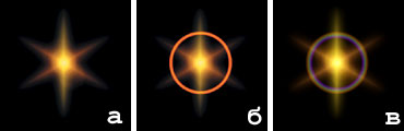 Рис. 10. Виды ореола: а — исходная звездочка; б — сплошной ореол (Filled); в — линзообразный ореол (Lenticular) |