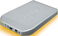 Это довольно-таки увесистое устройство помещено в ударопрочную силиконовую оболочку. Диск объемом 40 Гбайт снабжен двумя интерфейсами — USB 2 и FireWire, что делает его привлекательным и для пользователей ПК, и для поклонников Macintosh. Пожалуй, единственный недостаток данного накопителя — повышенная чувствительность к питанию: и с дополнительной платой USB, и с контроллером системной платы удалось добиться устойчивой работы только после подключения внешнего сетевого блока питания, входящего в комплект поставки.
