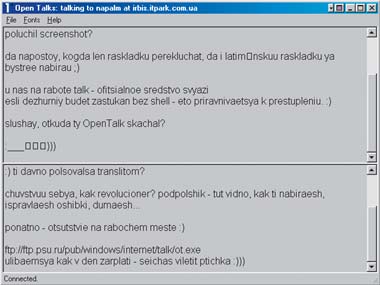 В былые времена с такими словами обращались друг к другу пользователи сетей Unix, если средств электронной почты почему-либо не хватало. Уже тогда существовала программа talk, которая помогала двум пользователям удаленных друг от друга терминалов без посредников поговорить в режиме реального времени. Система IRC (internet relay chat), предназначенная для общения по схеме «один со многими» и разработанная на несколько лет раньше, чем WWW (тогда существовал лишь ее прототип — gopher), прекрасно работает и до сих пор.
