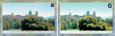 Чтобы придать рамке некоторый объем, воспользуемся эффектом Satin («Лоск»). Эффект Pattern Overlay («Наложение шаблона») позволяет создать на рамке блики и переливы, соответствующие отсветам протекающей реки. Остается добавить рамке скос и рельеф (эффект Bevel and Emboss) и сделать более резким ее контур посредством параметра Contour («Контур»). Теперь пришла пора полюбоваться творением наших рук (рис. 3, а). Рамка, выполненная в строгом классическом стиле, подчеркивает спокойную красоту величественного пейзажа. Река, занимающая едва ли десятую часть фотографии, несомненно, придает ей очарование. Блики же и переливы на рамке усиливают это впечатление. С помощью фильтра KPT effectsPyramid Paint можно превратить фотографию в картину, напоминающую творения импрессионистов. А вот рамку менять не нужно, она прекрасно подойдет и к этому изображению (рис. 3, б).