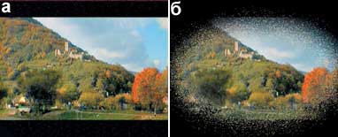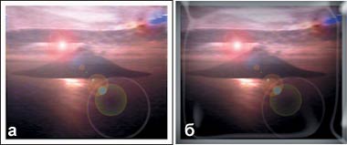 | Рис. 4. Рамка с оптическими эффектами прекрасно подойдет к фотографии солнечного заката: а — исходное изображение; б — изображение в рамке |