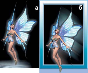 | Рис. 7. Эффект волшебного выхода из рамки эльфийки nVidia: а — исходное изображение; б — «фото» в рамке |