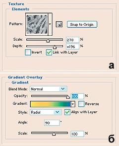 Теперь добавим еще один слой с рамкой, прибегнув ко второй технологии выделения — с постепенным увеличением прозрачности (изображение, которое должно получиться в результате выполненных действий, приведено на рис. 5, б). Здесь, помимо уже знакомых нам параметров, необходимо подобрать подходящую текстуру Texture и градиент Gradient Overlay. Итак, выберите шаблон (Pattern) текстуры и задайте для него подходящие масштаб (Scale) и глубину (Depth, рис. 6, а). Аналогично настраиваются и опции в панели Gradient Overlay («Градиент»): указывается градиент, а потом устанавливается для него стиль заполнения (Style) и режим смешивания (Blend Mode, рис. 6, б).