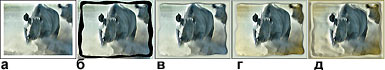 | Рис. 8. Добавление «динамичной» рамки к фотографии стремительно движущегося носорога: а — исходная фотография; б — создание контура рамки; в — придание рамке цветовой гаммы фотографии; г — главный герой в центре внимания; д — имитация объема рамки и фотографии |