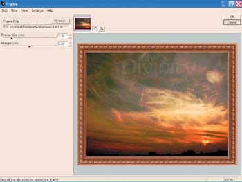 Позволительно также создать новые рамки и собственную коллекцию стилей. Чтобы нарисовать рамку, прежде всего надо определиться с размером изображения. Здесь следует учесть, что при наложении рамки на рисунок их размеры могут не совпадать друг с другом. Манипулируя параметрами Frame Size («Размер рамки») и Margin («Отступ»), можно изменить размеры рамки, подогнав их под формат рисунка. Как же в этом случае поведет себя фильтр Splat? Оказывается, он увеличивает рамку, не масштабируя ее, а заполняя недостающие детали шаблоном — куском самой рамки. Если при этом левая и правая границы шаблона имеют разный рисунок, то будет заметно место стыка. Для однородных рамок это несущественно, а вот для рамок с орнаментом подобное неприемлемо. Решить такую проблему можно, сделав элементы стыка одинаковыми.