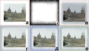 | Рис. 15. Этапы создания рамки: а - исходная фотография; б - шаблон рамки; в - затенение рамки; г - инверсия слоя; д - текстурирование; е - изменение цвета |