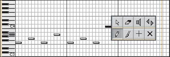 Новые ноты пишутся при помощи инструментов в виде карандаша и кисти. Первый позволяет рисовать каждую ноту и задавать ее длительность. Второй автоматически создает совокупность нот, чья длительность определяется квантизацией (Quant), и располагает их согласно параметру Snap (см. рис. 4, в верхней панели). Инструмент стрелка позволяет перемещать и дублировать ноты (так же как и в окне Arrange), ластик - стирать выбранные, динамик - прослушивать те, над которыми пользователь располагает курсор. С помощью инструмента в виде двух треугольников выполняется пошаговое перемещение нот вдоль временн?ой шкалы, согласно параметру Snap. При этом по умолчанию нота, на которой щелкают этим инструментом, сдвигается влево, а при нажатой клавише - вправо. Инструмент в форме крестика играет роль своеобразных ножниц, удаляя ноты, находящиеся справа, или контроллеры сверху. Он полезен, к примеру, когда нужно сократить длительность звучания группы нот, расположенных линейно (по вертикали либо диагонали), или уменьшить значения контроллера для какой-либо их последовательности. Для этого достаточно отметить отрезок данным инструментом, указав начальную и конечную точки. И последний инструмент, обозначаемый символом «Ё», предоставляет возможность заглушать отдельные ноты. Просто щелкните им на нужной ноте, и при последующем проигрывании она звучать не будет.