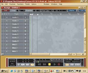 Он выполняет функции, аналогичные функциям мультитрекового режима программы Cool Edit Pro (см. «Мир ПК», №5/03, с. 142, №6/03, с. 136). То есть основная задача Arrange - управлять музыкальным материалом. Сюда входит загрузка файлов (MIDI-форматов, оцифрованного звука, а в последних версиях пакета - и видео), их запись, настройка «инструментов» воспроизведения, манипулирование каналами (а также клипами, из совокупности которых могут состоять каналы).