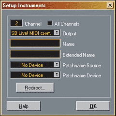 Прежде чем приступить к работе, необходимо настроить MIDI-канал, указав нужный банк, и выбрать инструмент. Эти операции можно выполнить в панели параметров канала. Пока нам требуется только один пункт - Patchname, который мы рассмотрим в примере ниже.
