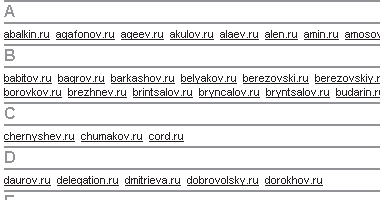 Иной путь выбрало интернет-агентство Well. Воспользовавшись тем, что в России не существует практики разрешения споров по доменам, использующим имена и фамилии (да и мировая практика по данному вопросу очень неоднозначна), эта хапперская контора в период с декабря 2001 по февраль 2002 г. зарегистрировала на себя 5 тыс. доменных имен в зоне RU, совпадающих с фамилиями известных людей (политиков и бизнесменов), потратив на это 100 тыс. долл. Среди «похищенных» — Владимир Жириновский (Jirinovsky.ru), Шамиль Басаев (Basaev. ru), Александр Коржаков (Korzhakov.ru), Егор Гайдар (Gaidar.ru), Геннадий Зюганов (Zuganov.ru). Полный список доменов выложен на сайте компании: http://names.well.ru.