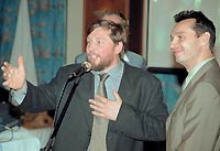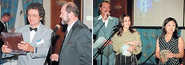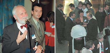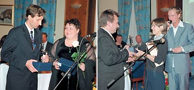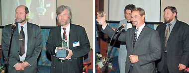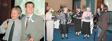 Первый главный редактор журнала «Мир ПК» Ю.А. Кузьмин вручает приз «ответственному за сети» М. Глинникову (фото 10, слева направо) и памятный адрес нынешнему главному редактору А. Орлову (фото 12).