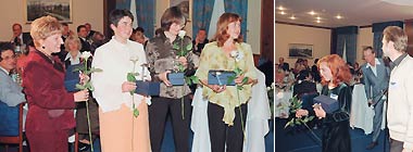 Какие радостные лица у только что получивших в подарок юбилейные хрустальные часы художественного редактора О. Кузнецовой, дизайнера Н. Гольдберг, художника М. Мотовой и ответственного секретаря редакции Н. Шаховой (фото 3, слева направо)!