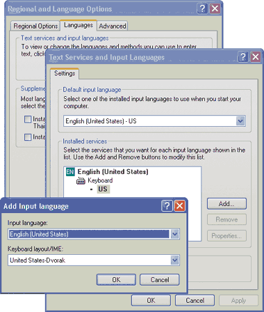 Чтобы переключиться на эту раскладку в Windows XP, сначала выберите опции «Пуск?Панель управления» (Start?Control Panel). Если в окне Панели управления обнаружится надпись «Выберите категорию» (Pick a category), то щелкните на кнопке «Переход к классическому виду» (Switch to classic view). Дважды щелкните на кнопке «Язык и региональные стандарты» (Regional and language options) или выберите соответствующую позицию в меню Панели управления, щелкните на закладке «Языки» (Languages), выберите «Подробнее» (Details) и щелкните на кнопке «Добавить» (Add). Наконец, в ниспадающем списке «Раскладка клавиатуры или метод ввода (IME)» (Keyboard layout/IME) выберите позицию «США—международная» (United States-International).
