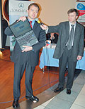 Поскольку корпус ноутбуков IBM, выполненный из титанового композита, оснащен укрепленной рамкой экрана, а жесткие диски устройства снабжены миниатюризированными подушками безопасности, то прямо во время конференции журналом «Мир ПК» был предложен и проведен маленький стресс-тест на падение этого дорогостоящего спутника делового человека на пол с высоты человеческого роста. Выполнять столь впечатляющий эксперимент со своим родным устройством вызвался руководитель департамента персональных систем IBM Денис Решетов. Подводя итоги незапланированной лабораторной работы, отметим, что Денис не только безжалостно подбросил своего друга вверх , но еще и постоял на нем некоторое время. И что же ? Несомненно, компания IBM может гордиться своими мобильными компьютерами — модель IBM T30 после приземления продолжила работать без видимых сбоев от «рекламного варварства» Дениса.