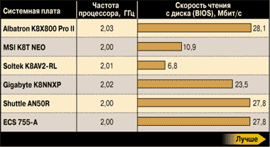 Плата K8X800 Pro II лидировала в тестах Performance Test 4, 3Dmark2003, WinRAR-архивировании и при измерении скорости произвольного доступа к памяти. Можно было бы назвать провальными результаты, показанные при перекодировании видео- и аудиофайлов, но при повторении этих экспериментов в среде ОС Windows 64-bit они улучшились. Это свидетельствует о том, что ПО еще не оптимизировано. В игровых тестах были получены стабильно средние результаты. Общий итог работы с платой Albatron — звание «Лучший выбор».