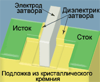 Фрэнк Спинглер, вице-президент подразделения корпоративных технологий компании Intel, заявил, что его корпорация для перехода на 45-нм технологии планирует изменить материал диэлектрика затвора. Сейчас используется оксид кремния, SiO2, но при 90-нм техпроцессе его толщина составляет всего 1,2 нм, т. е. пять атомных слоев, а при 65-нм нормах она будет равна уже трем-четырем слоям. Столь тонкая прокладка между электродами вызывает токи утечки (туннельный эффект позволяет электронам проходить даже через изоляторы), а значит, повышает примерно на 40% энергопотребление и тепловыделение транзистора. Многие компании ищут материал для изолятора с высоким диэлектрическим сопротивлением, чтобы повысить толщину зазора между затвором и каналом, не нанося ущерба процессу управления током между истоком и стоком. Материал, который применит Intel, будет объявлен ближе к запуску 45-нм производства. Предполагаю, такая микросхема появится уже к 2005—2006 гг.
