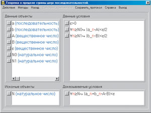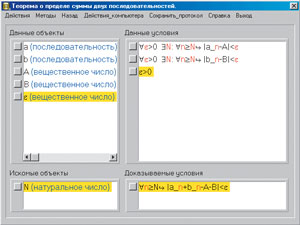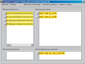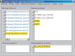 |a_n + b_n - A - B|< ε. Это объясняется тем, что программа «ТеорМат» выполняет некоторые действия автоматически, облегчая работу пользователя. Информацию об автоматических действиях, проделанных компьютером на данном шаге, можно получить, нажав пункт меню «Действия_компьютера». В нашем примере, согласно общим принципам доказательства, при доказательстве условия ∀ε>0 ∃N: ∀n≥N
