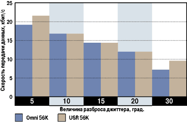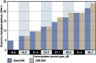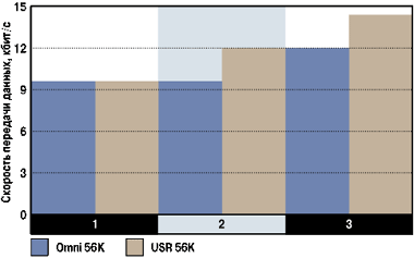 Результаты измерений зависимости скорости передачи от фазовых искажений испытываемых модемов приведены на диаграмме 1. При маленькой разнице между сигналом и шумом модель Omni 56K снижает скорость передачи данных до 4800 бит/с, а USR 56К вообще не устанавливает соединения. При увеличении разности сигнал/шум несколько вперед по скорости передачи выходит модем фирмы U.S. Robotics.