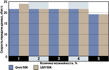 Влияние величины нелинейности на скорость передачи испытываемых модемов представлено на диаграмме 3. Результаты теста показали, что по устойчивости к этому параметру оба модема также практически идентичны.
